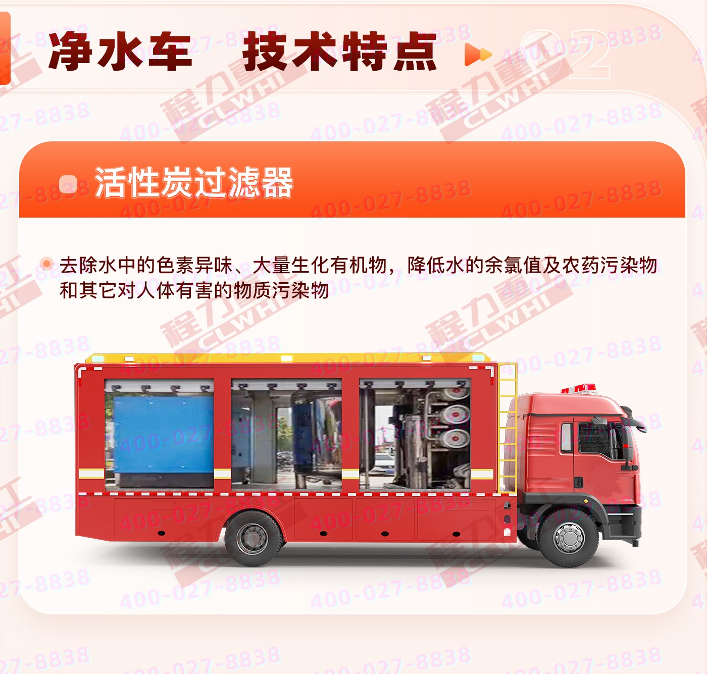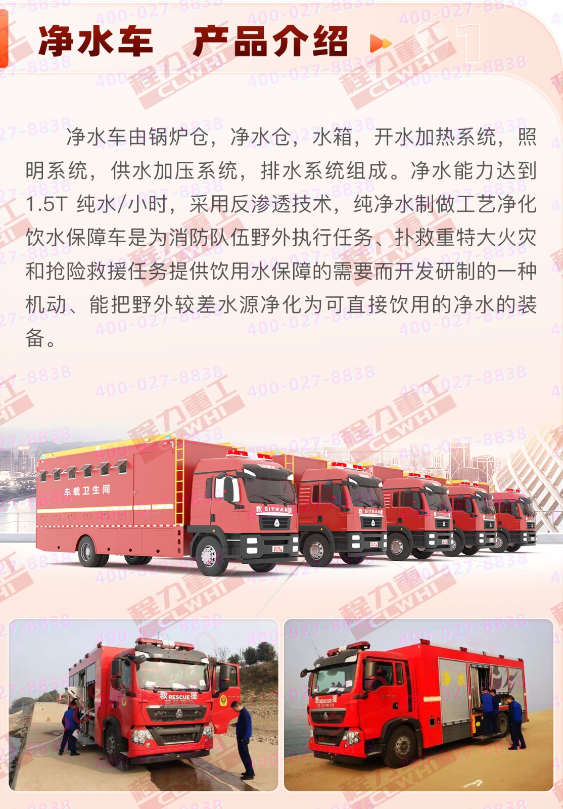重汽豪沃凈水車由我公司在基型車重汽污水處理車基礎上進行排放升級而成, 此凈水車由重汽4*2二類底盤,凈水車專用大廂,鍋爐倉,凈水倉,水箱,開水加熱系統,照明系統,供水加壓系統,排水系統組成。凈水能力達到1.5T純水/小時,采用反滲透技術,純凈水制做工藝.凈化飲水保障車是為消防隊伍野外執行任務、撲救重特大火災和搶險救援任務提供飲用水保障的需要而開發研制的一種機動、能把野外較差水源凈化為可直接飲用的凈水的裝備。