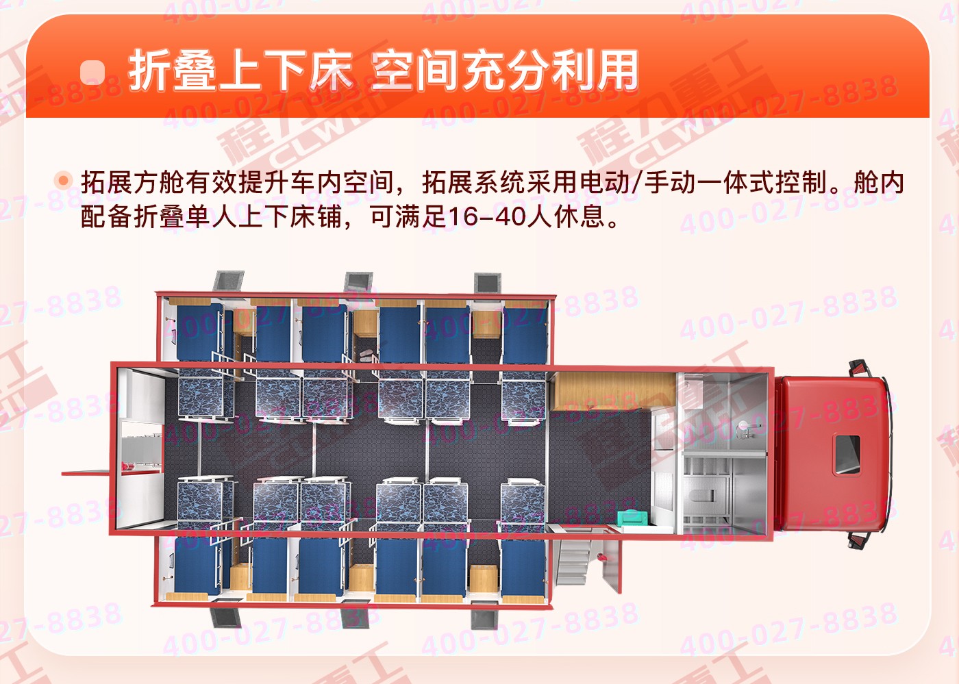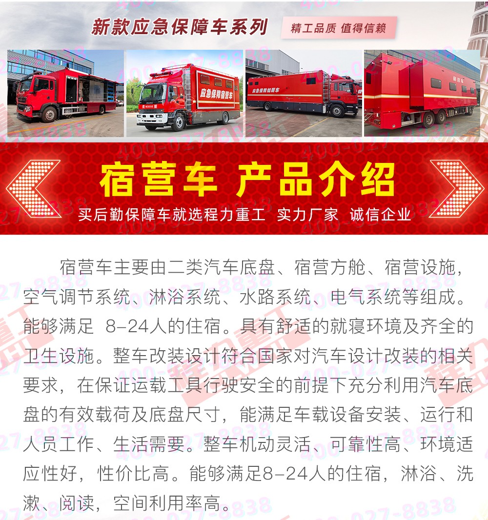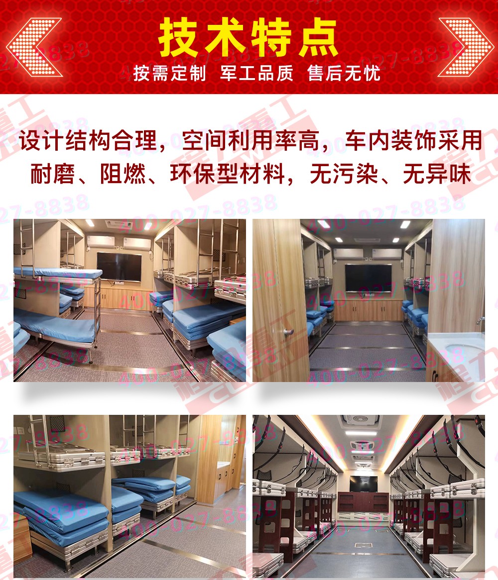 能夠滿足12人的住宿、閱讀、寫作、具有舒適的就寢環境及齊全的衛生設施。整車機動靈活、可靠性高、環境適應性好、性價比高等特點。(可根據客戶要求改裝)