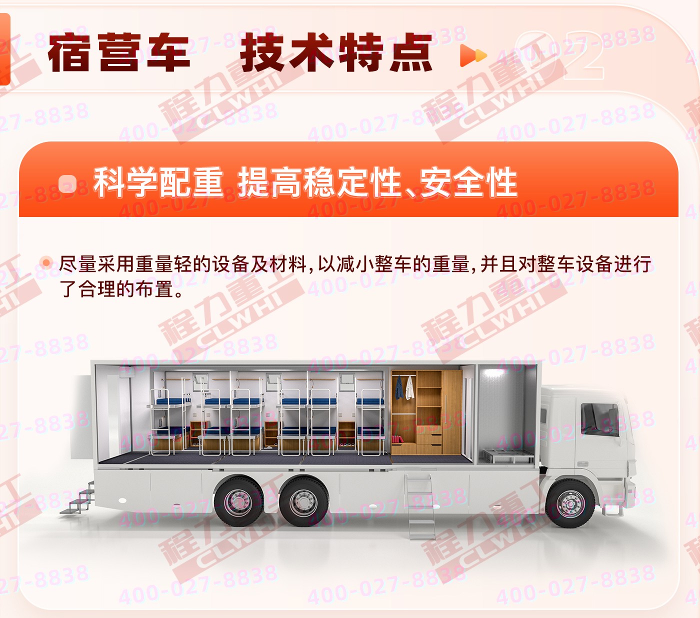 重汽豪沃底盤、箱體(鋼骨架、內、外蒙皮)宿營設施、上下床鋪、空氣調節系統、影視系統、電氣系統、安全系統整車配備衛生間、廚房柴油發電機、蓄電池、凈水箱、污水箱,空調外加輔助裝備等。