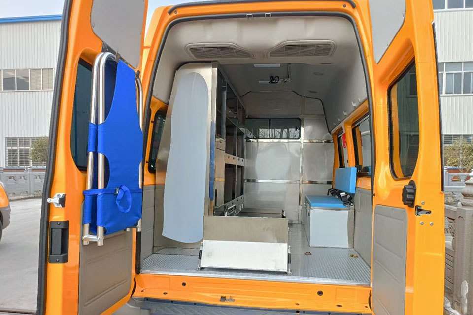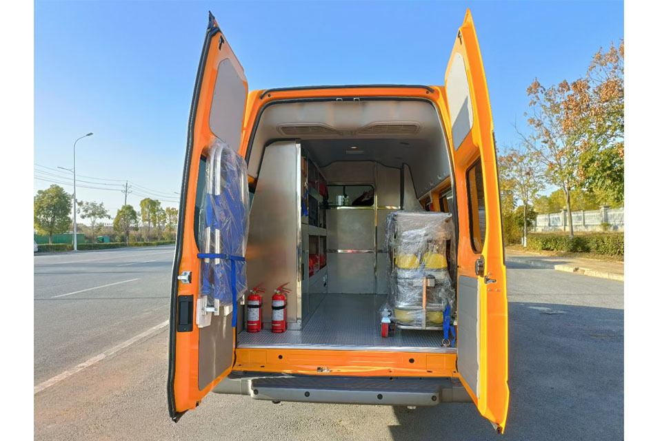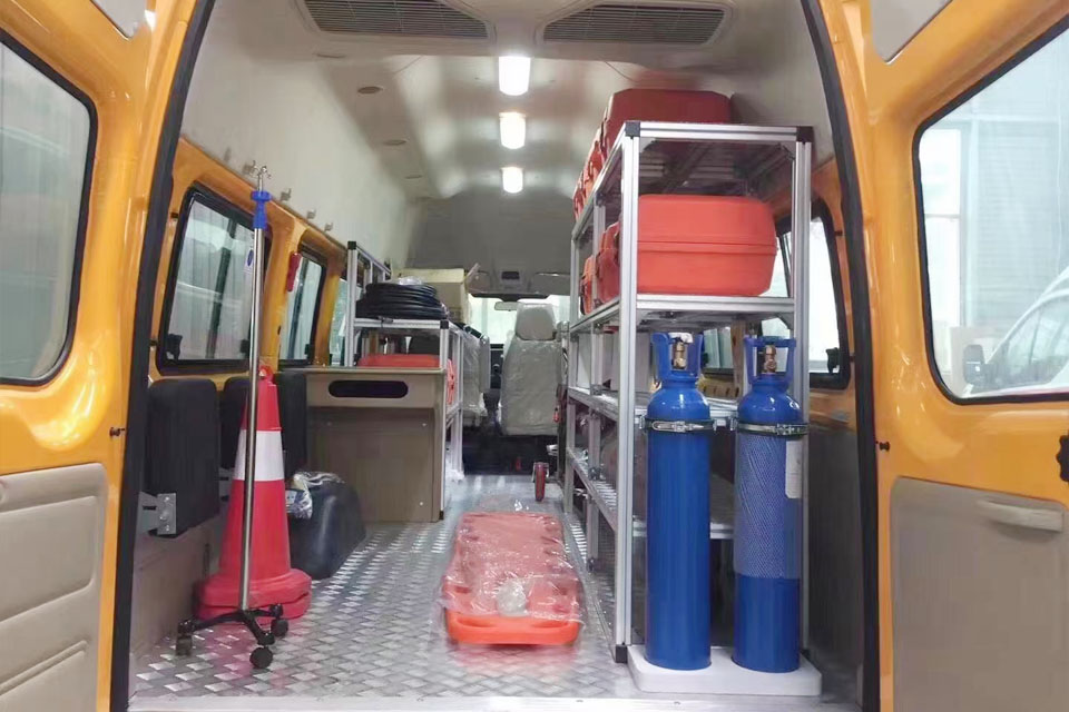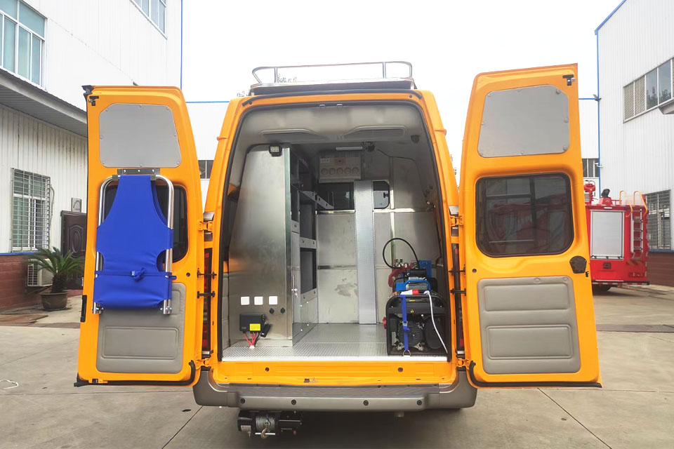 車輛搭載夜間照明燈,監控攝像存儲,數據傳輸,音像系統,氣體防護設備,傷員簡單救護,氧氣供應,擔架急救和辦公語音調度等現場作業設備。