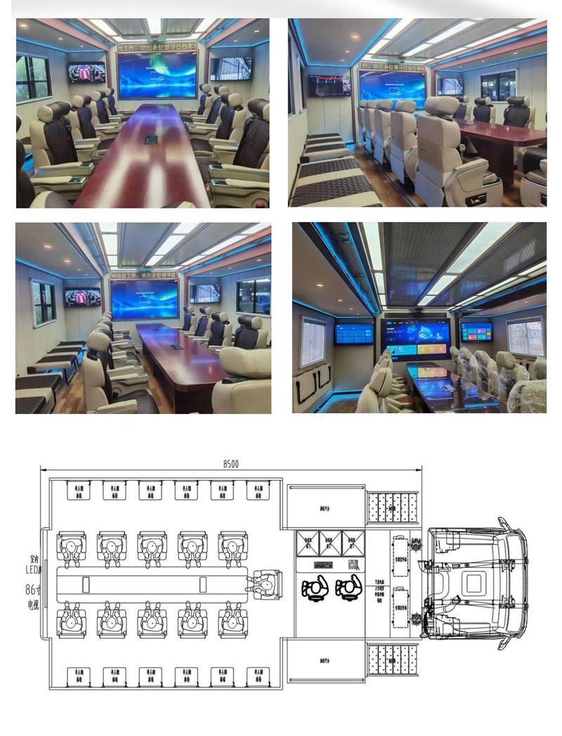 重汽后雙橋大型指揮車:重汽汕德卡6*4底盤,軸距:5000+1400mm 總質量:21000Kg,整車尺寸:11270*2550*3990mm,車內配備9人會議桌椅,另配4個壁掛式折疊座椅,廂體前部為會議區中間部為設備操作區,廂體尾部為休息區(底部安裝發電機組).
